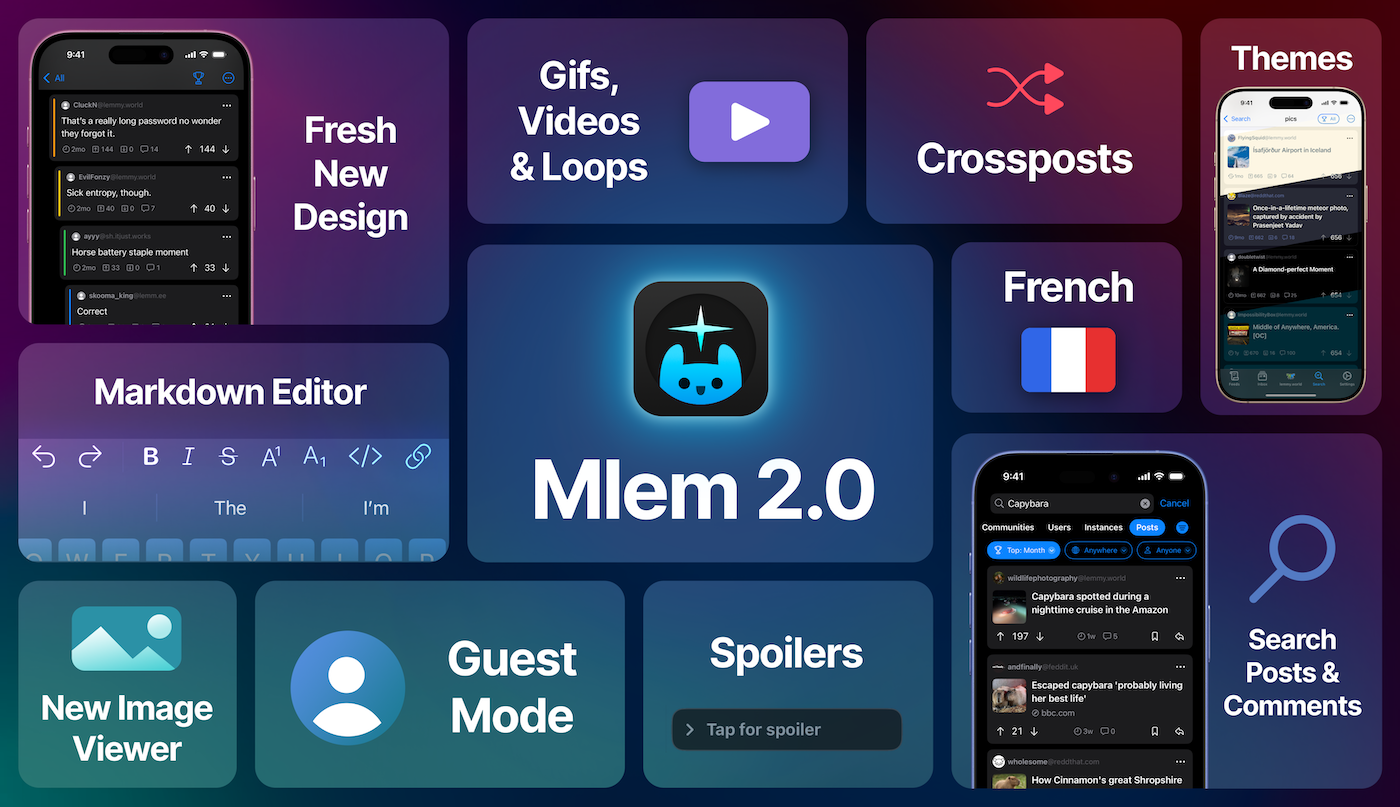 Compatibility Notice: Mlem 2.0 supports iOS 17 and later. If you are on an older iOS, you won’t be able to download this update but will be able to continue using the previous version of Mlem.
