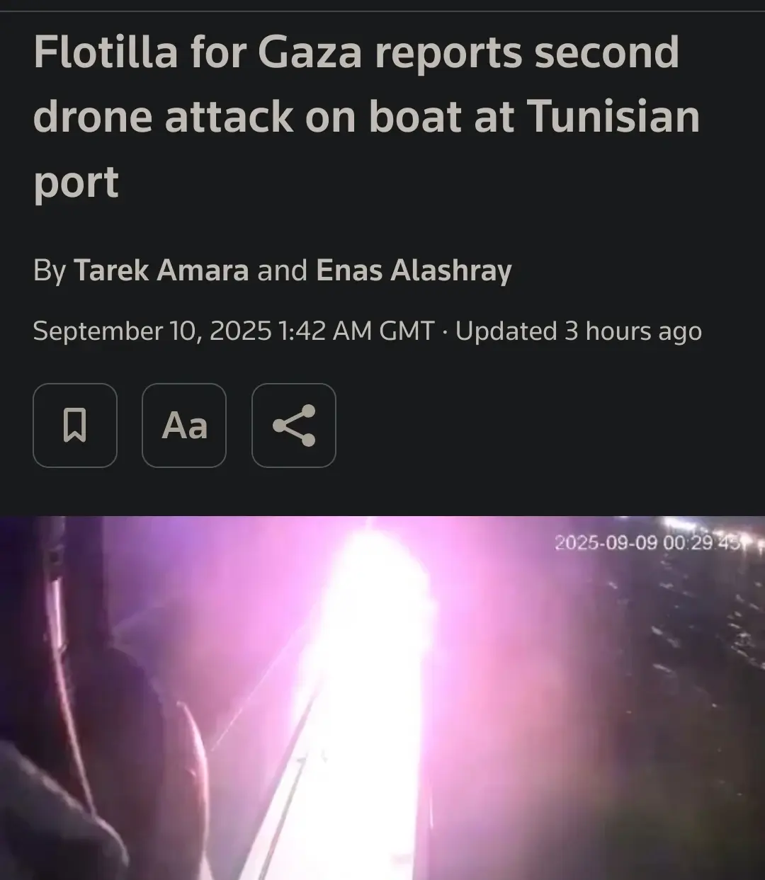 two nights in a row they keep bombing Greta. But it’s nothing compared to what they are doing to people of Gaza https://www.reuters.com/world/middle-east/flotilla-gaza-reports-second-drone-attack-boat-tunisian-port-2025-09-10/