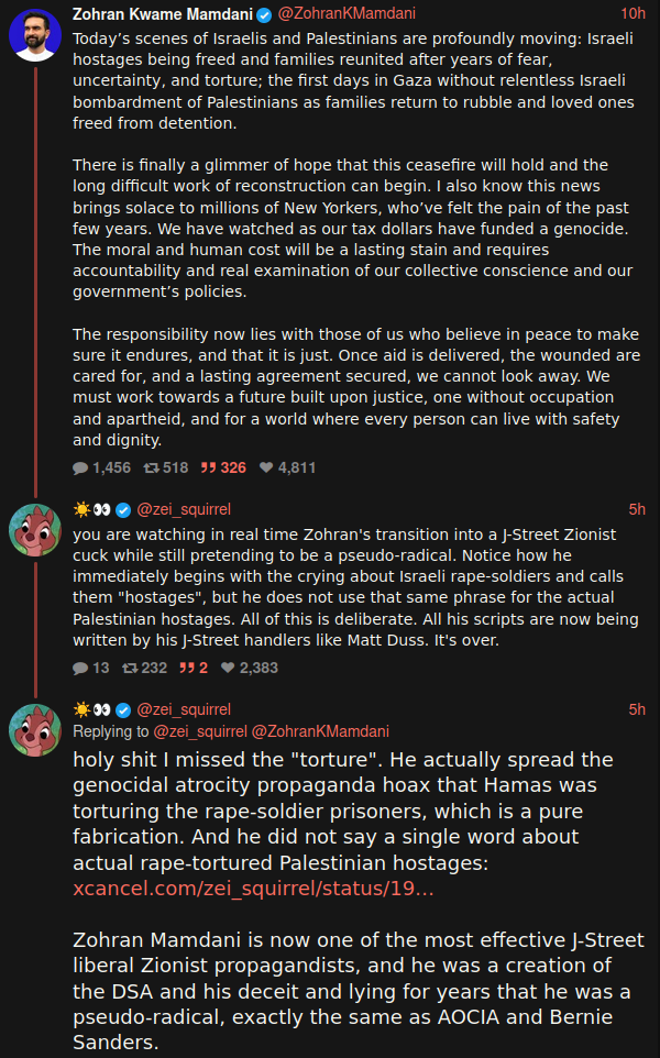 Zohran actually started off really well, refusing to condemn all of oct7, no unnecessary placating to Zionists etc, calling the police racist in the past, etc. Only in the last months after he won the primaries have things started to go downhill like this. The DNC infiltration in his team is in full force.