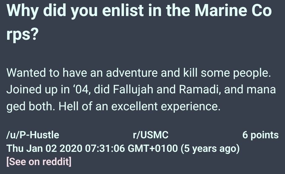 Begs the question: Which is worse, to actively foment genocide and war crimes on an industrial level while pretending publicly to be a good, honest, and moral politician, or to kill people in a war, as a soldier or contractor ordered to be there, and then shitpost about it on Reddit later?