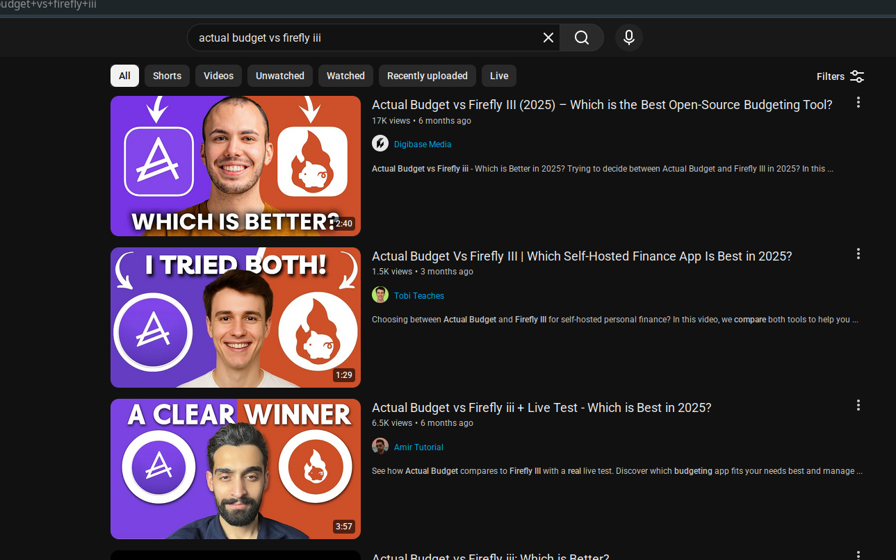 Anyone have a good comparison video? I’m just wanting a decent comparison of Actual, Firefly III and possibly HomeBank. Feel free to also give me your 2 cents on whatever you use :)