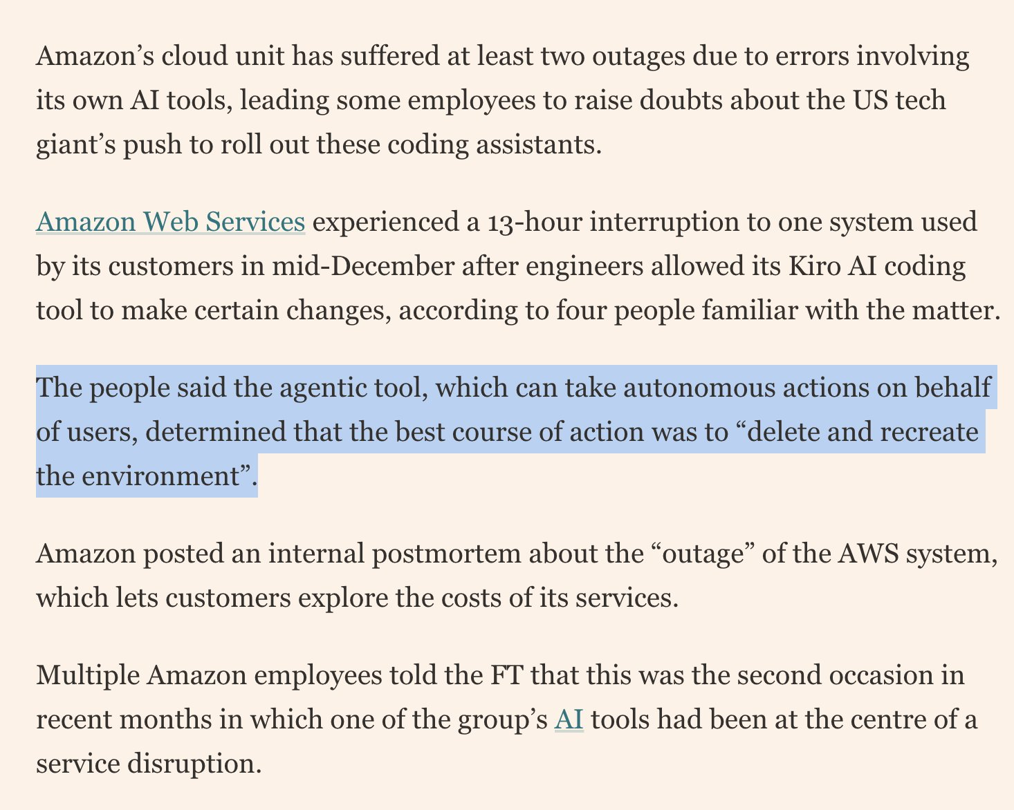 arrow-up1273arrow-down1imageAmazon's internal agentic tool decided that existing code was inadequate and decided to replace it taking down a part of AWS for 13 hours, and was not the first time it had happened. 🤣lemmy.ml☆ Yσɠƚԋσʂ ☆@lemmy.ml to Programmer Humor@lemmy.mlEnglish · 9 天前message-square24linkfedilinkfile-text