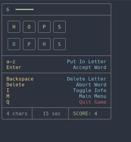 All words contain all letters. To input a letter, type a to z, lower case. To quit, type Q, upper case.